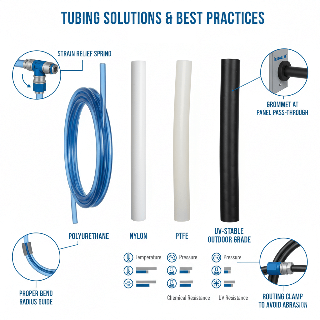 | Tube/hose degradation | UV, oil, heat, abrasion | Select proper material; add guards and routing; periodic replacement |